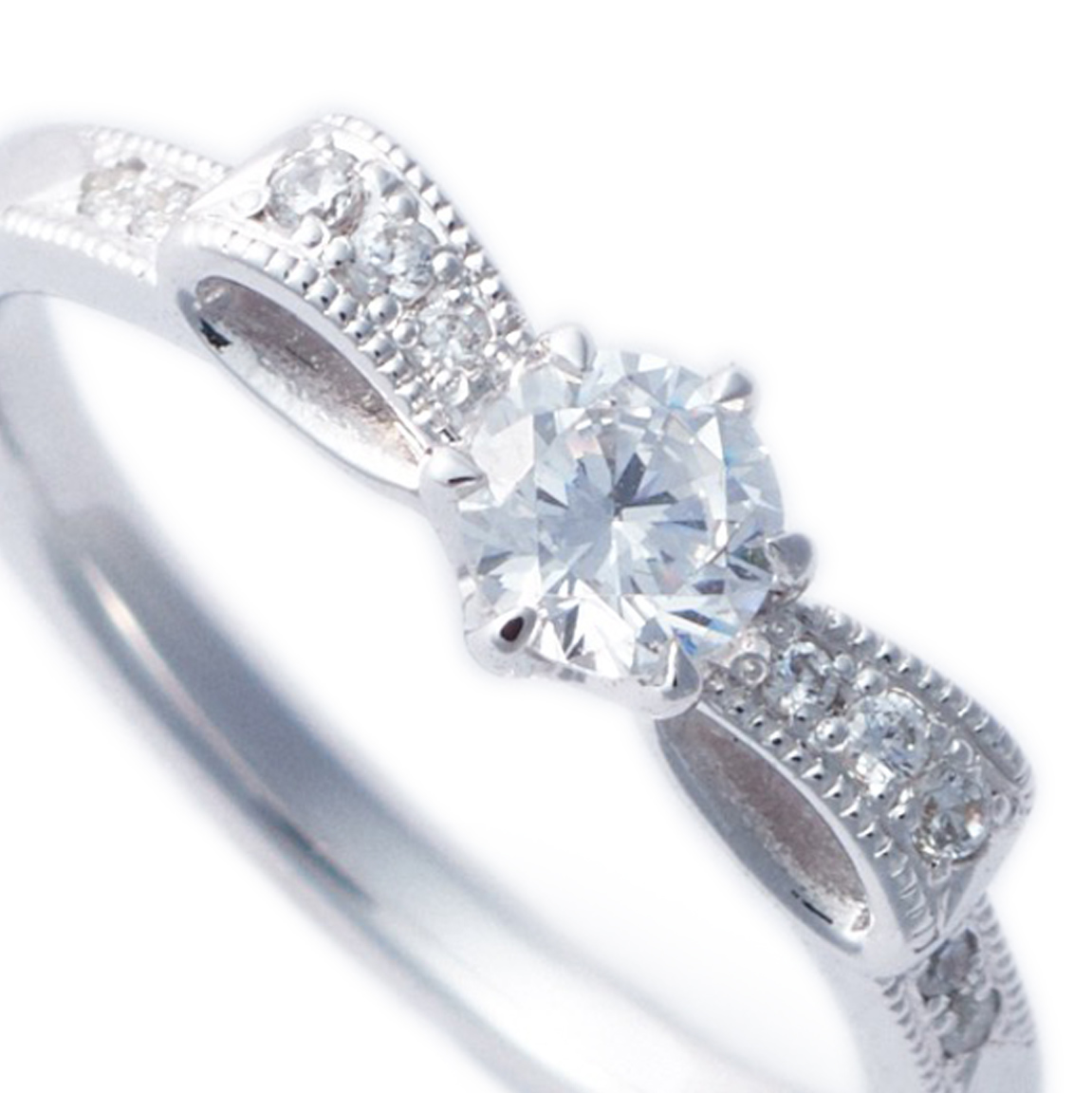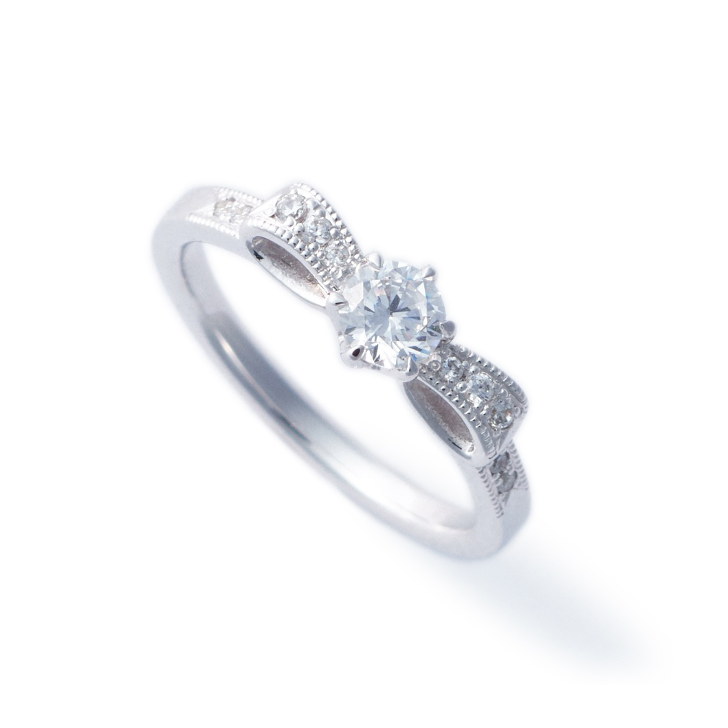 This engagement ring reproduces the three-dimensional form of a ribbon bow. The presence of the diamond on the center of the bow is enhanced by the diamonds set on the sides of the bow.