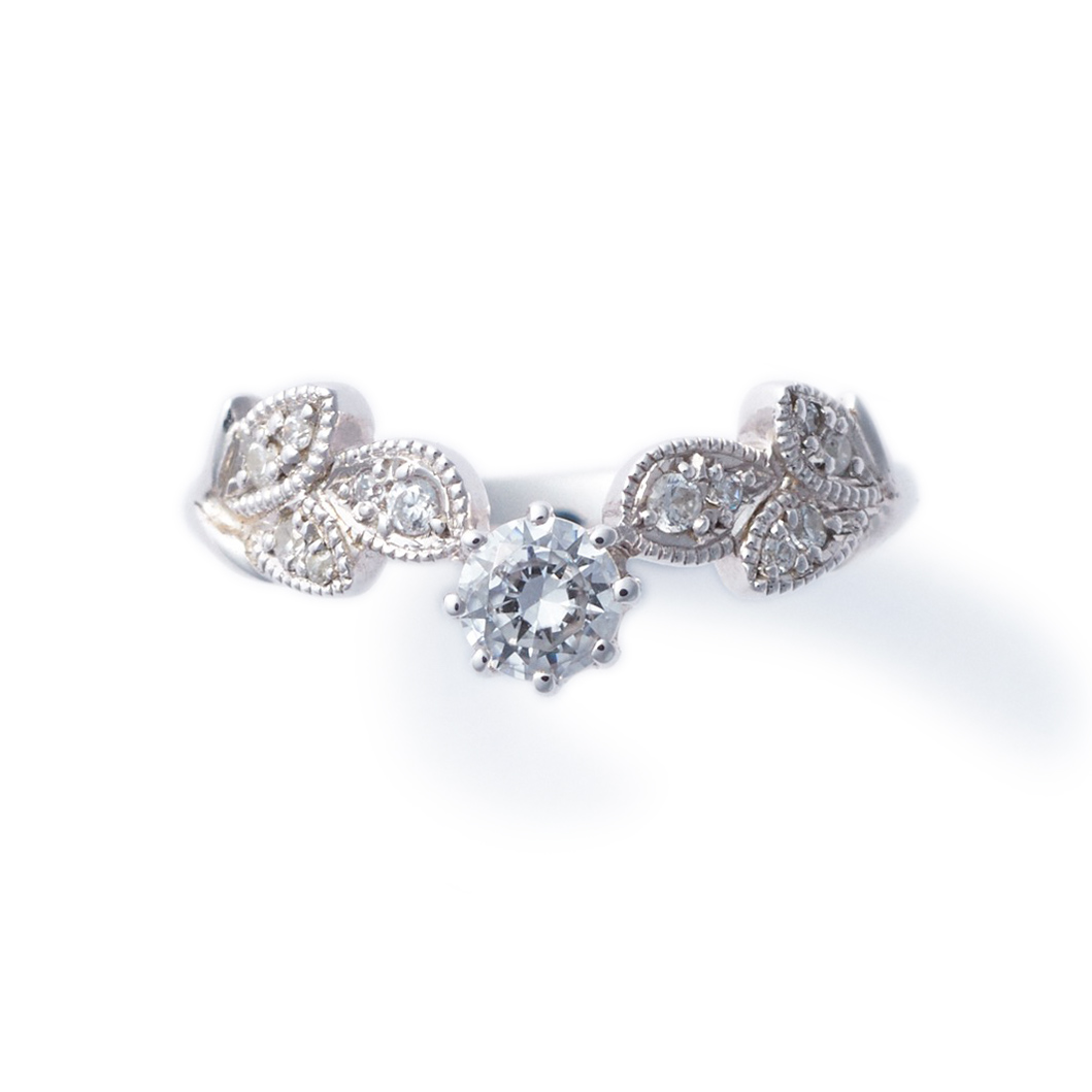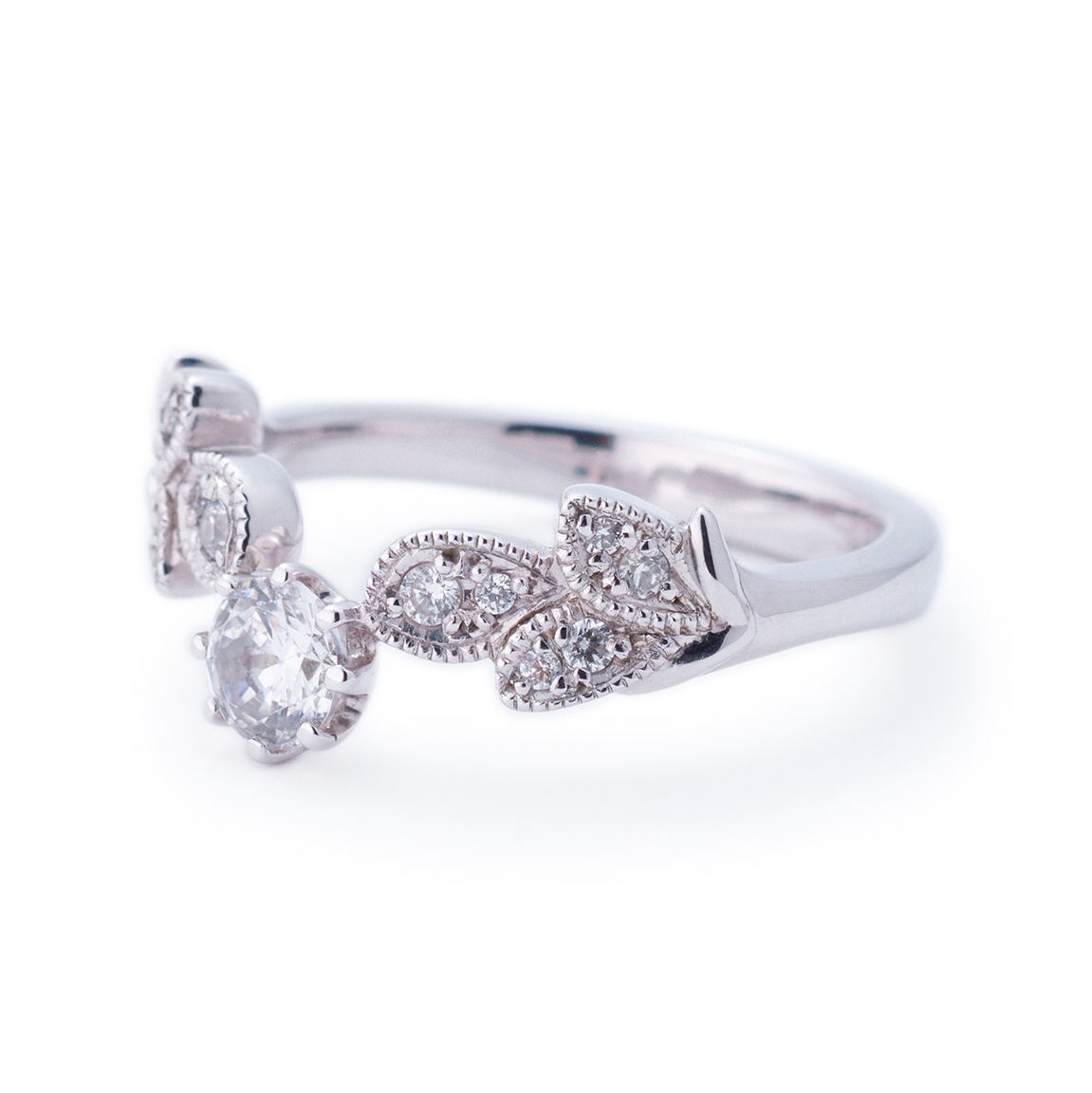 An ivy wedding band to tie the couple together and an engagement ring with a single blooming flower.