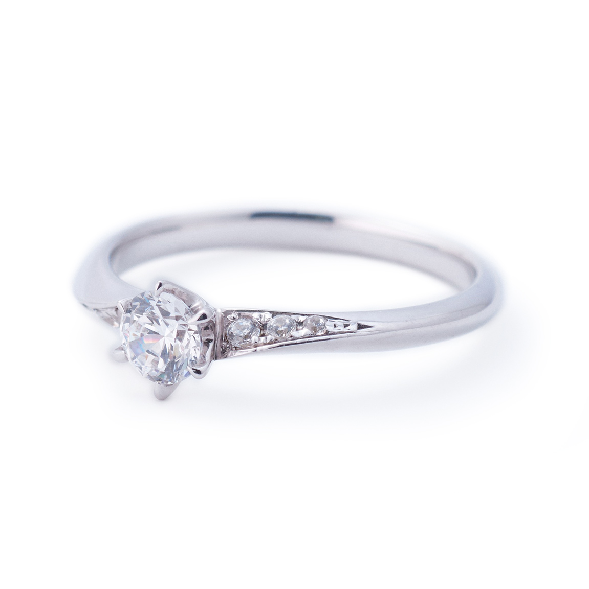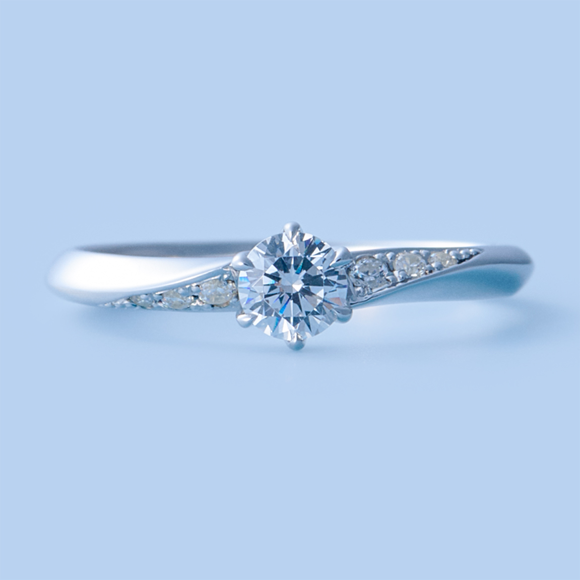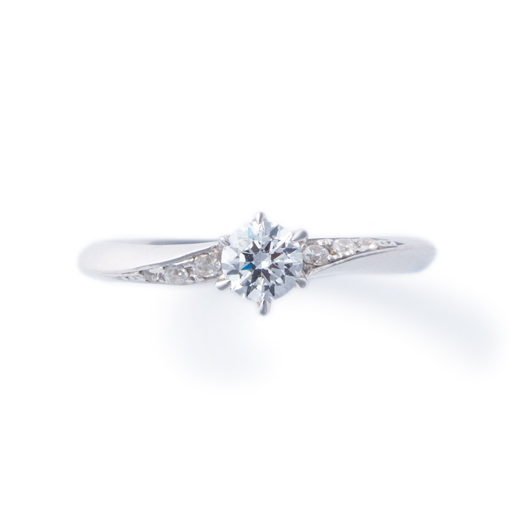 An engagement ring where diagonally set melee diamonds create a sleek appearance at the finger. Named "Oblique," from the shape that resembles a twist, meaning "diagonal." The design ensures durability and comfort by setting the central diamond low and embedding the side melees into the metal to minimize snagging, making it suitable for long-term wear.
