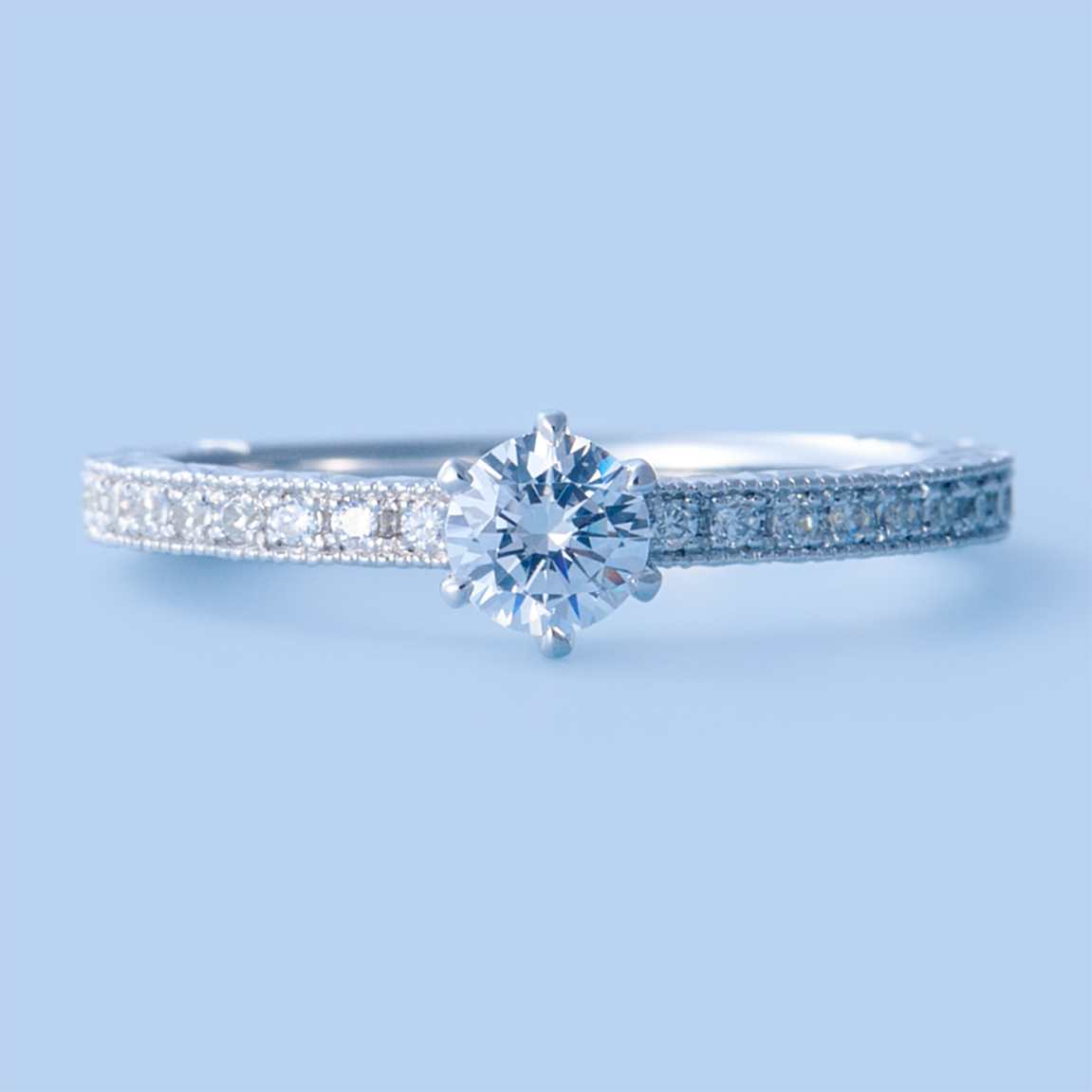 The "Iris" features a tall setting that makes the diamond sparkle brilliantly. The iris motif represents "gentle heart" and "elegance" in the language of flowers. The half-eternity melee diamonds and milgrain decorations add a touch of glamour.
