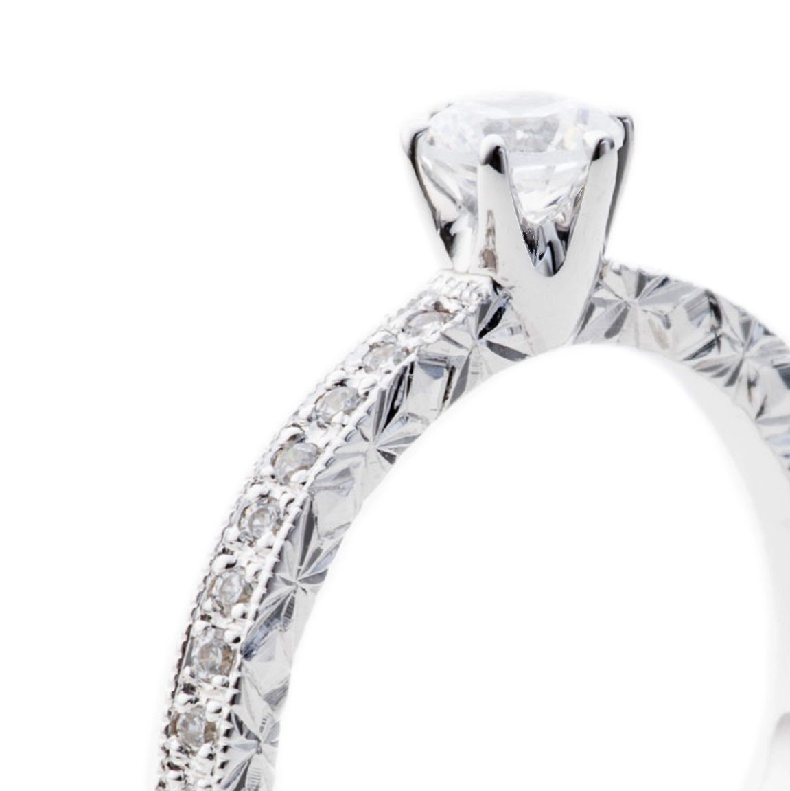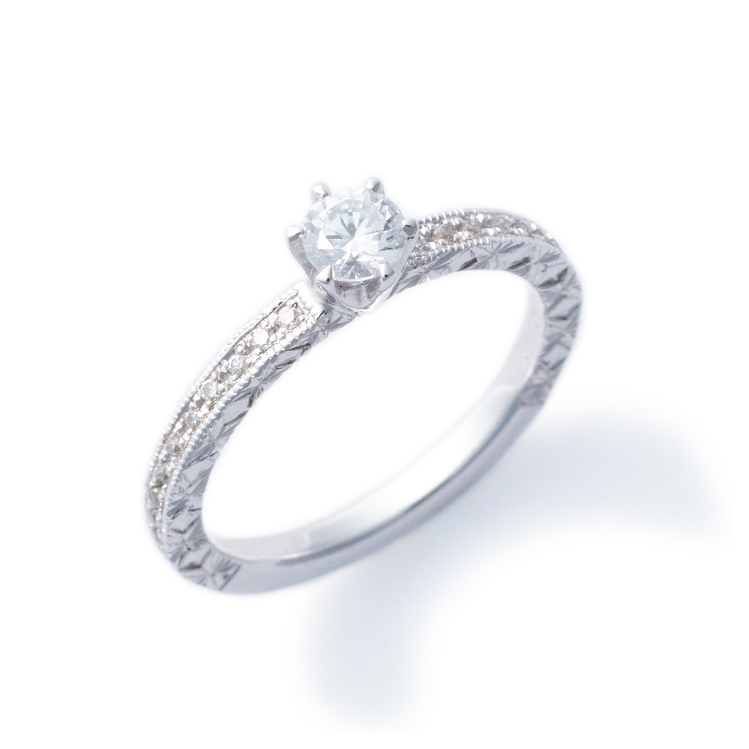 The ring's elevated diamond setting facilitates easy layering with a wedding band. The motif of Japanese engraving on the sides is star anise, which allows the ring to radiate brilliance from every angle.