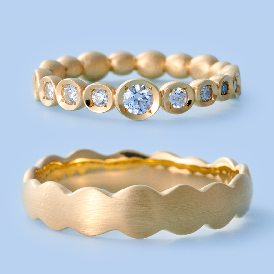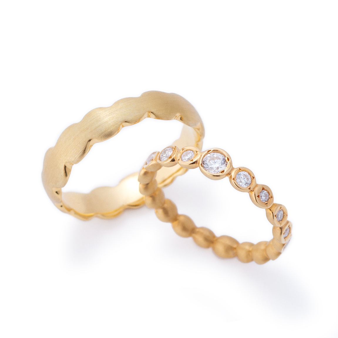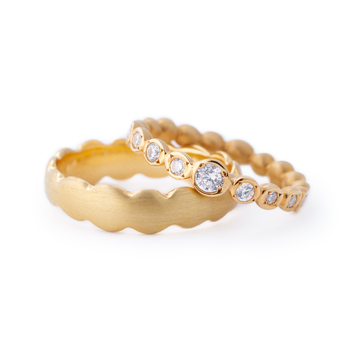 Wedding rings that add a sense of unity to each unique form with a hammered pattern.