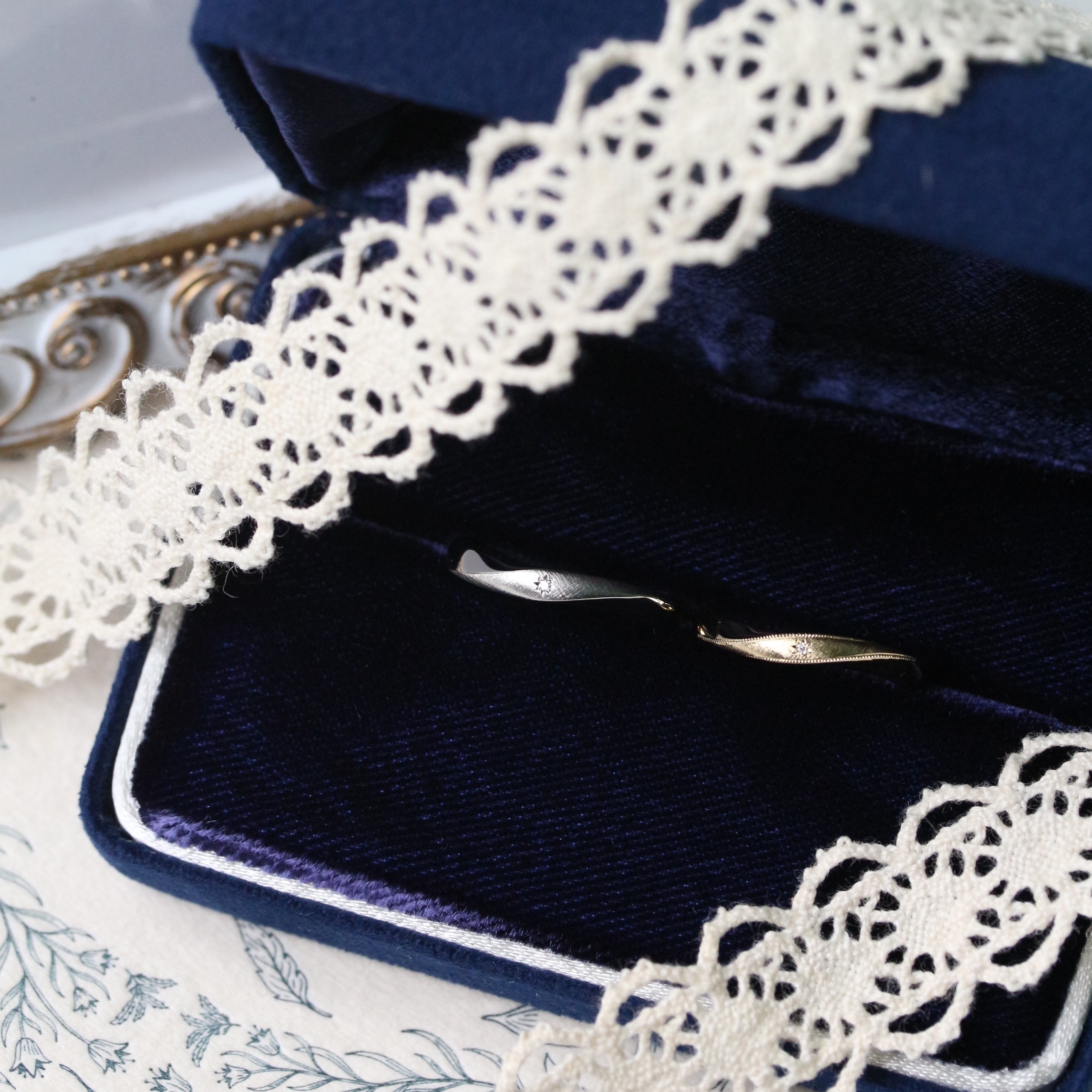 the women's design features milgrain.