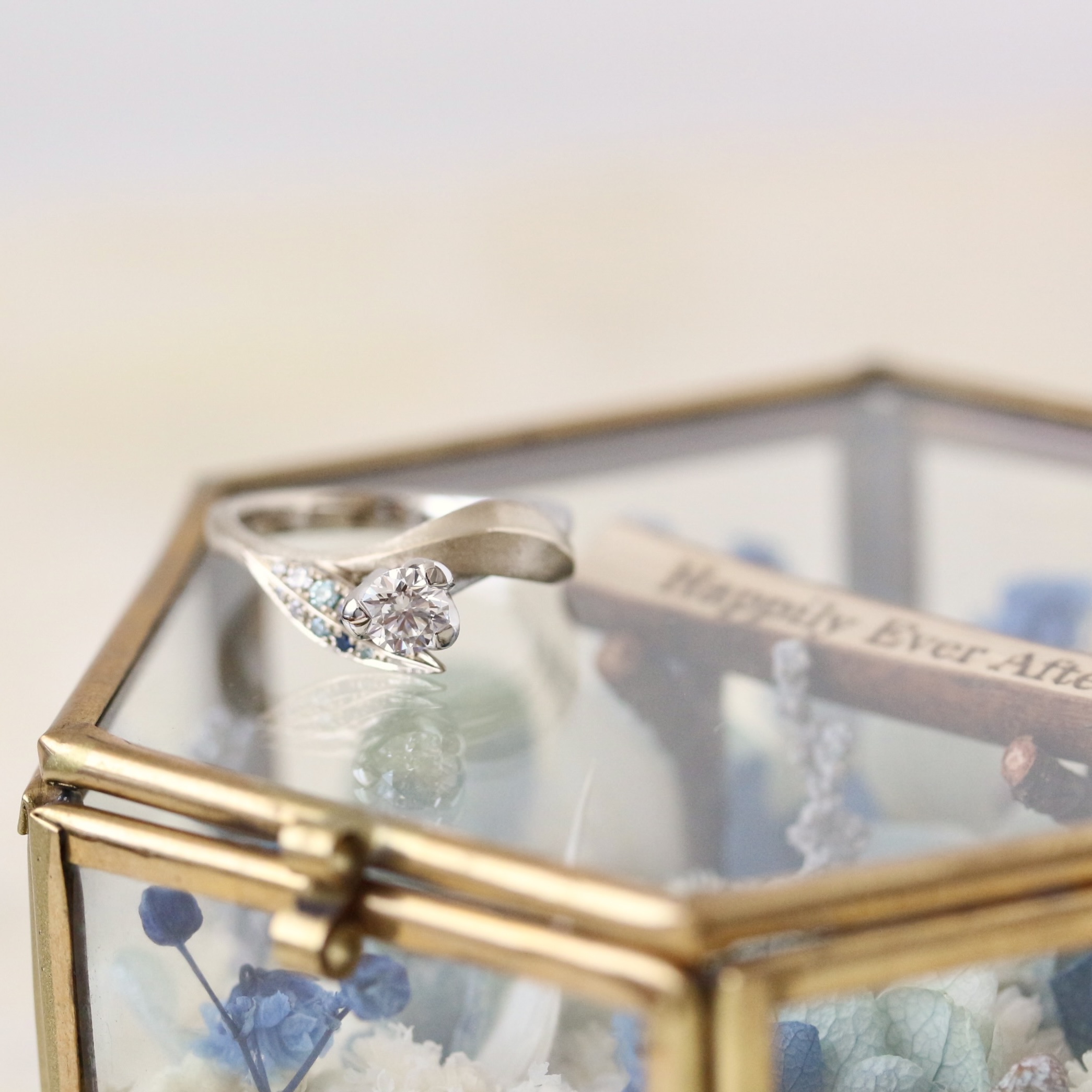 For the small stones set along the striking large leaf area, we insisted on including a vivid blue reminiscent of Okinawa's sea, the place where you two met.