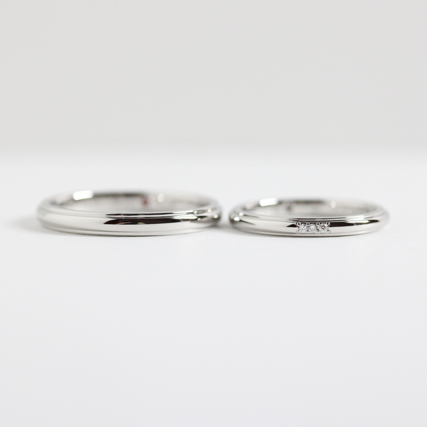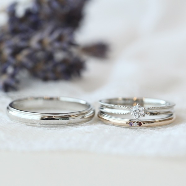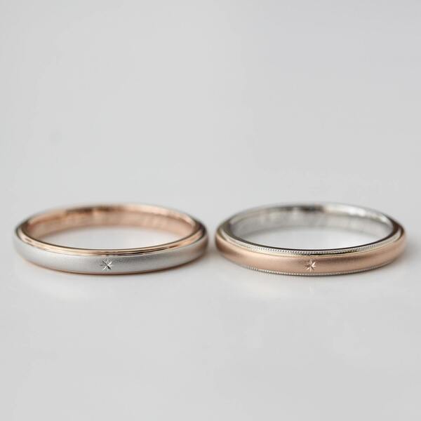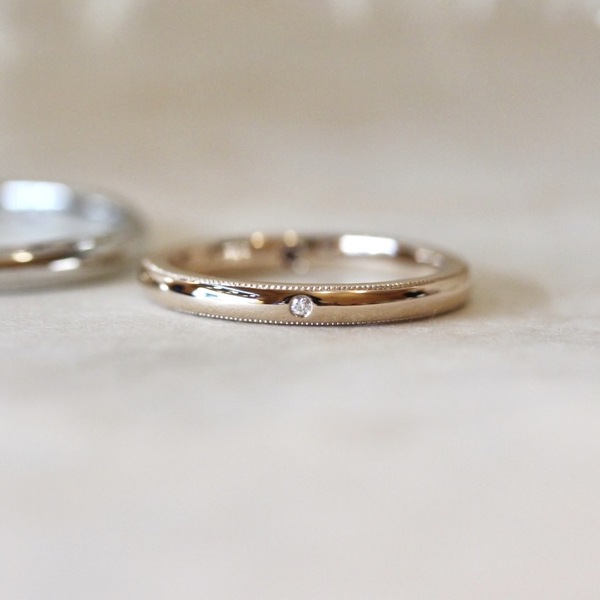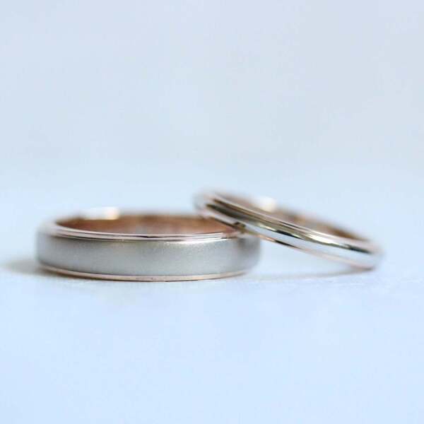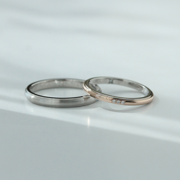 A wedding ring beautifully balancing simplicity with rounded curves and defined edges. The two-tone color using pink gold blends seamlessly with the skin, making the slender ring appear even more delicate and refined.