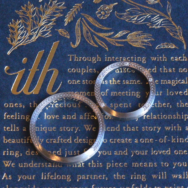 From the front, it appears as a simple semi-matte design. When worn, the subtle leaf pattern and tiny milgrain visible from the sides offer a design with a classical impression.