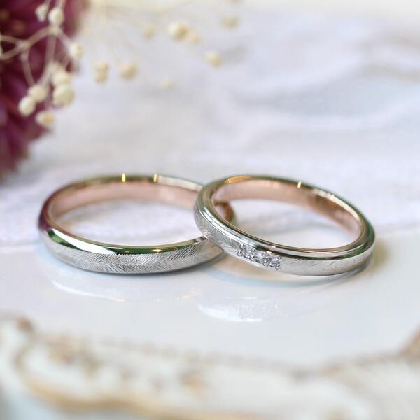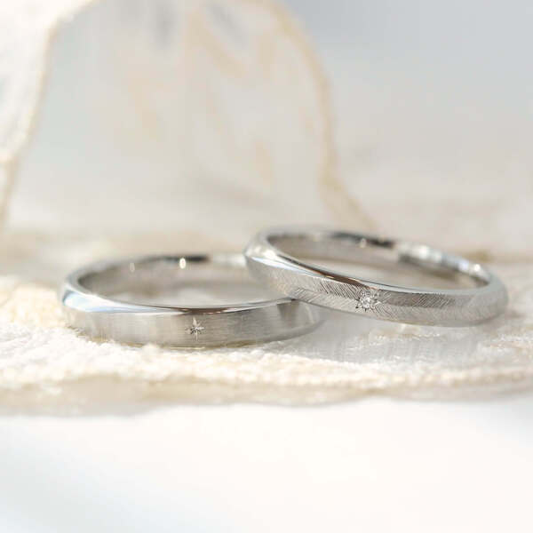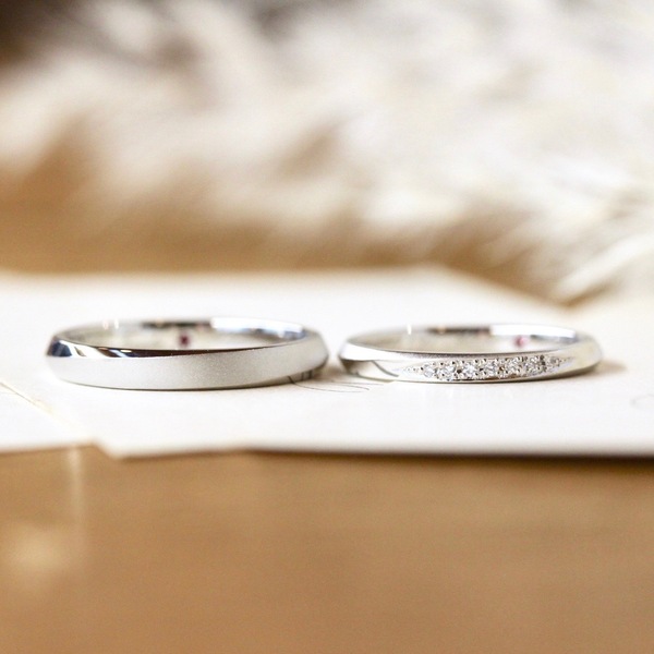 This wedding ring, with its simple form and slender lines, exudes elegance, featuring a matte hairline finish and a glossy mirror finish separated by an edge, offering two distinct textures.