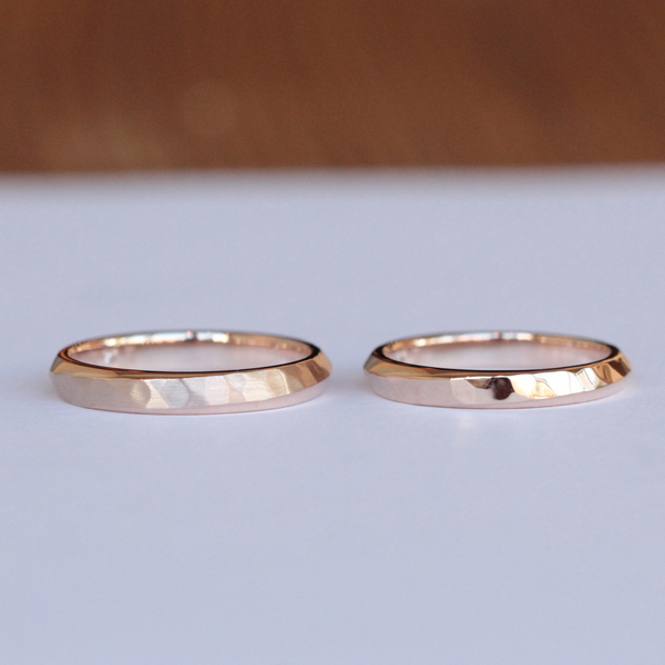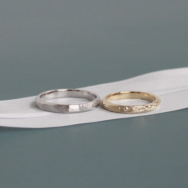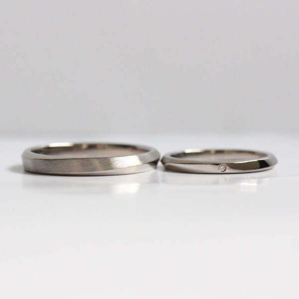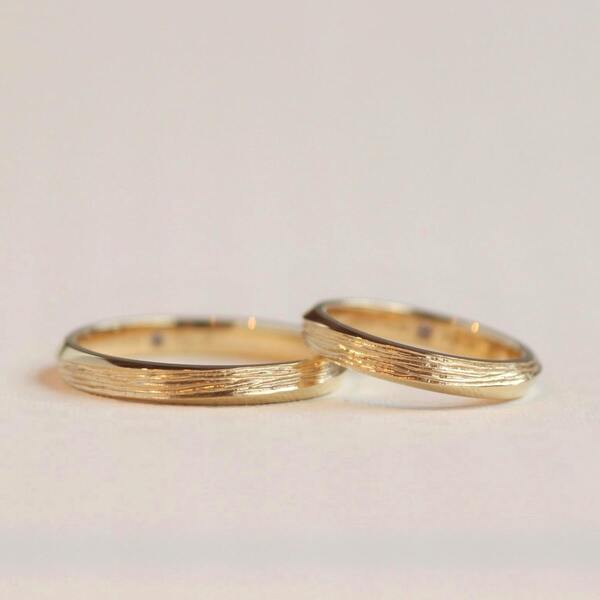 This wedding ring, with its simple form and slender lines, exudes elegance, featuring a matte hairline finish and a glossy mirror finish separated by an edge, offering two distinct textures.