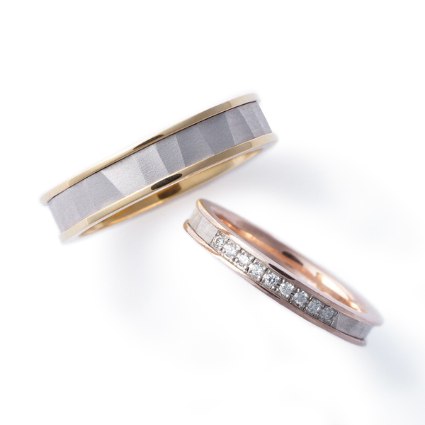 The combination color wedding rings are made by laminating two different colors of metal with different textures. The part which framed the ring has a mirror finish and the part of the surface has a matte finish with hammered patterns.