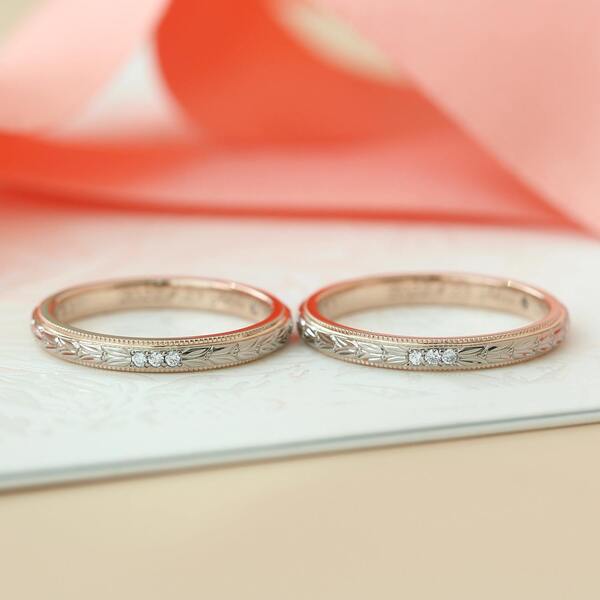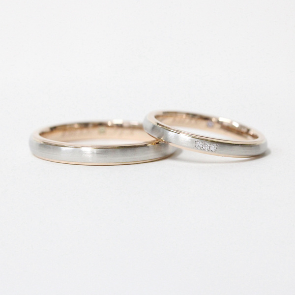Featuring a matte hammered texture, milgrain along the edges, and a combination of metals, this wedding ring incorporate the abundant craftsmanship of the artisan, while maintaining the dignified impression characteristic of wedding rings.