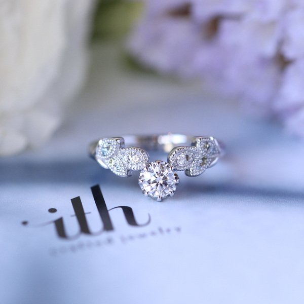 Named "Fiore," meaning "flower" in Italian, this engagement ring features a central diamond depicted as a flower, surrounded by leaf motifs edged with milgrain, evoking the ambiance of antique jewellery.